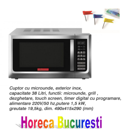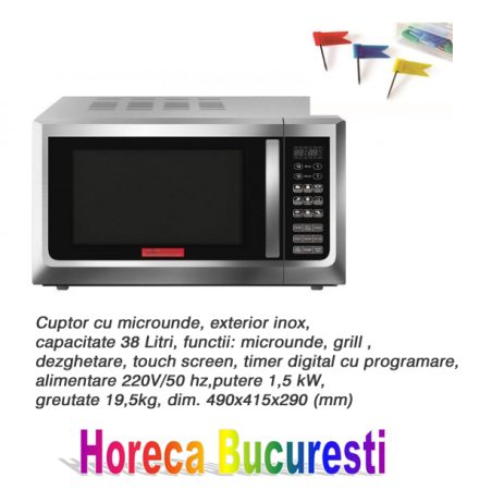 Cuptor cu microunde, exterior inox, capacitate 38 Litri, functii: microunde, grill , dezghetare, touch screen, timer digital, cu programare, alim. 220V/50 hz, putere 1,5 kW, greutate 19,5kg,