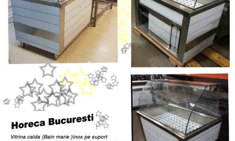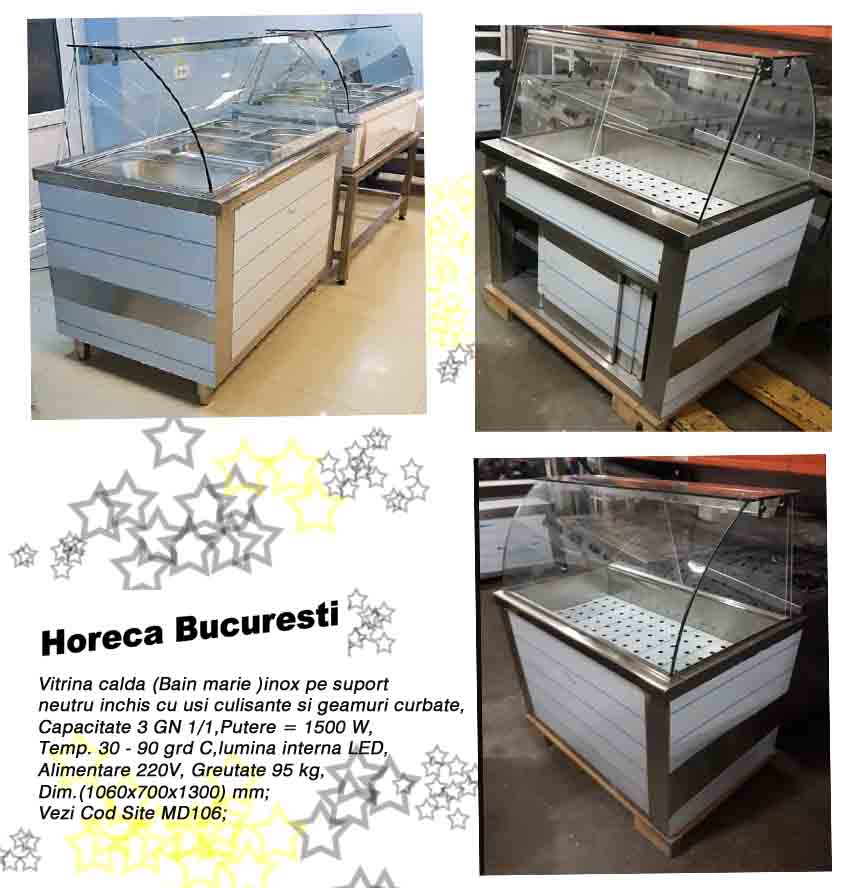 Vitrina calda (Bain marie) inox pe suport neutru inchis cu usi culisante si geamuri curbate, Capacitate 3 GN 1/1, Putere = 1500 W, Temp. 30 – 90 grd C, lumina interna LED, Alim. 220V, Greutate 95 kg,